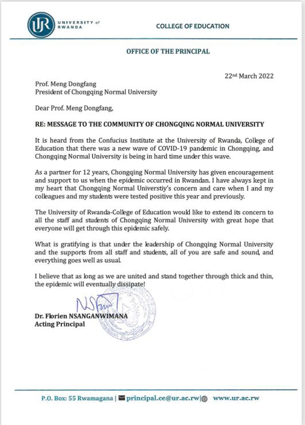 卢旺达大学教育学院是Beat365第一所孔子学院的合作伙伴。近日,得知重庆出现疫情后,卢旺达大学教育学院弗洛里安校长向Beat365孟东方校长发来慰问信,表达对学校全体师生的关心和问候。