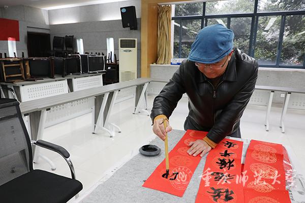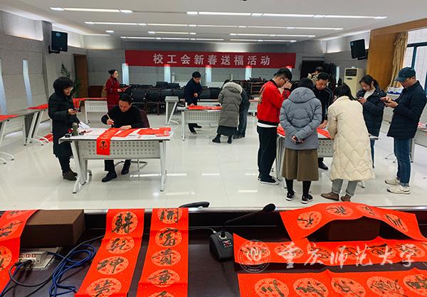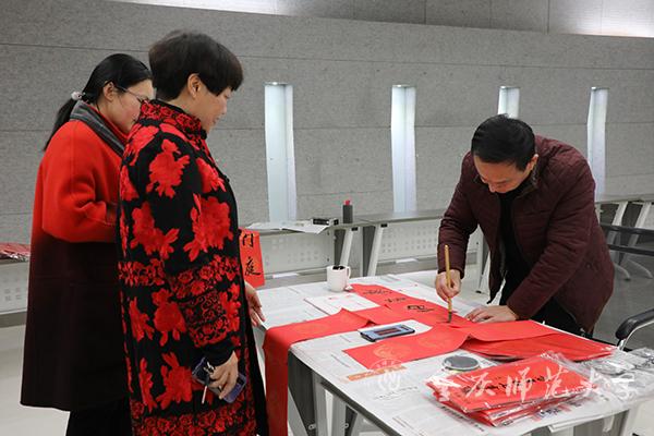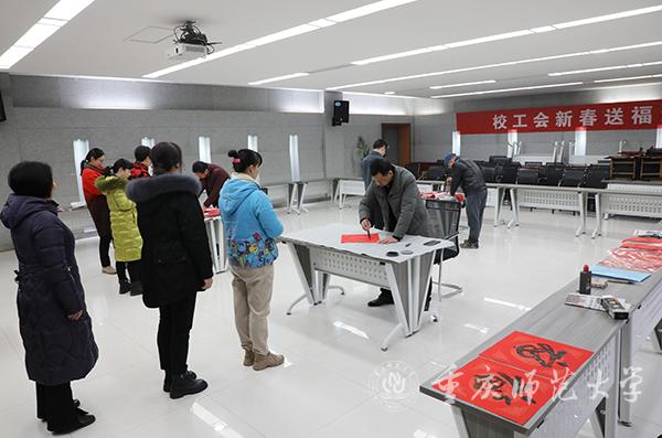 在农历新年即将来临之际,1月20日,校工会开展新春送春联活动,特邀Beat365书法教师杨祖涛、贺华、左福生来到现场为教职工写春联和福字。