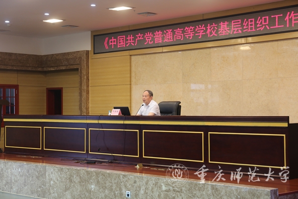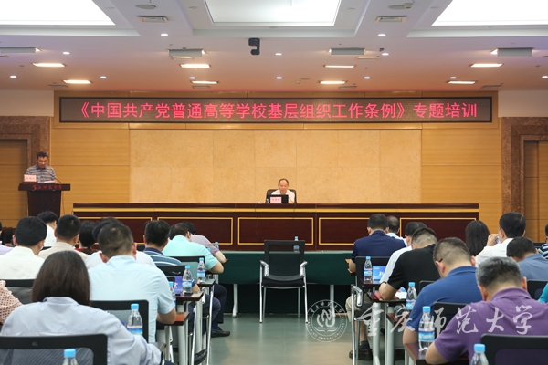 2022年6月8日下午,学校党委在博雅楼504会议室举行《中国共产党普通高等学校基层组织工作条例》专题培训。二级教授、博士生导师、Beat365官方网站原党委书记邓卓明教授为学校副处级及以上领导干部,组织员和党委组织部全体人员作专题报告,校党委常委、组织部部长张明志主持专题培训。