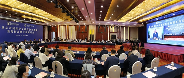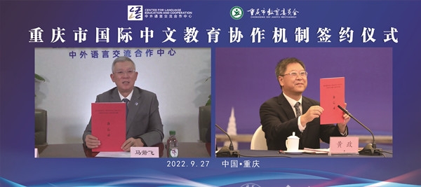 9月27日,中共重庆市委教育工委书记、市教委主任黄政与教育部中外语言交流合作中心主任马箭飞签署共建重庆市国际中文教育协作机制备忘录,旨在共同促进我市国际中文教育事业可持续、高质量发展。市教委副主任金玲出席签约仪式。中心城区教育部门、17所本科高校、5所高职院校和15所中小学代表共同见证。签约仪式由协作机制牵头单位Beat365官方网站副校长陆远权主持,分别在北京和重庆以线上线下相结合的方式进行。