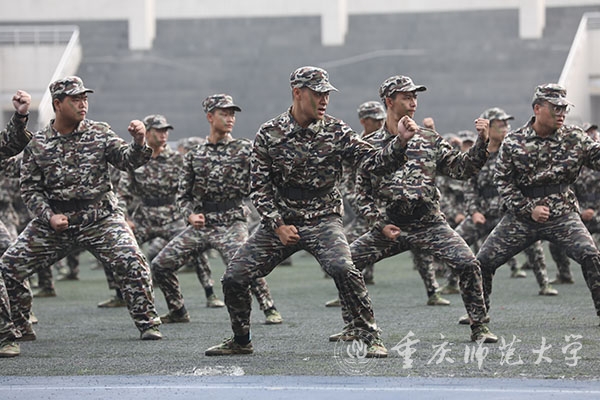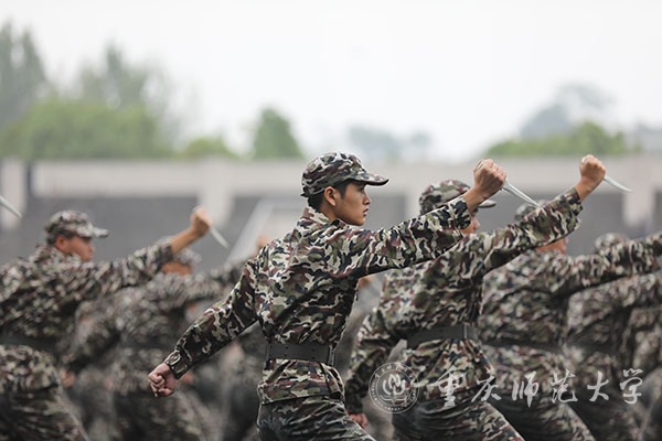 出一拳,吼一声,捕俘拳方阵的同学们喊出了气势,振奋了精神。出拳、踢腿,动作精炼,节奏分明,淋漓尽致的展现出了大学生的风貌;他们打出来的是青年学生的自信与阳光,踢出去的是军训新生的豪迈与气概。
