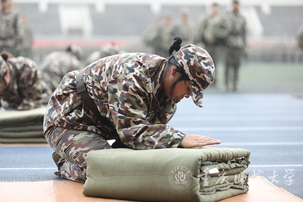 背包连的同学们争分夺秒,熟练地叠起被子,打起背包,用日常内务整理展现了他们在军训中养成的良好习惯。