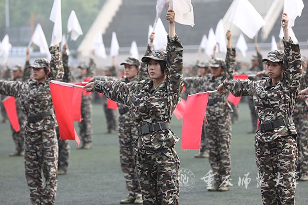 旗语方阵中,同学们有节奏地挥动手中的旗子,红旗与白旗在动静之间传递不同信息。
