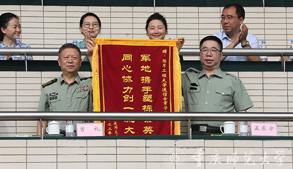 汇报演出结束后,陈志军副书记宣读了军训先进连队、优胜连队和优秀指导员表彰通令。孟东方校长代表学校向承训部队赠送锦旗,表达了对承训教官的感谢与认可。