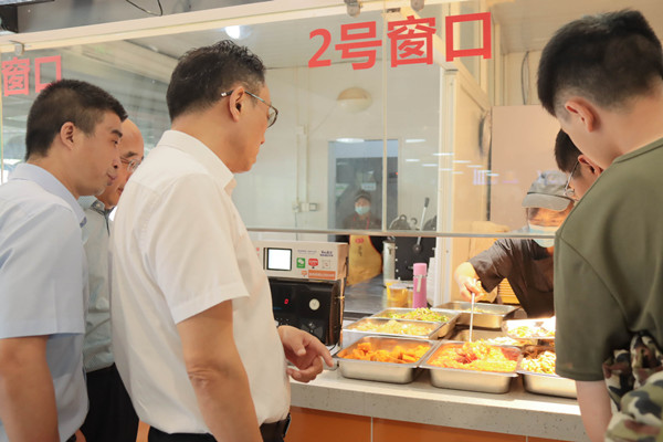 陈志军一行首先到训练场视察军训工作,关心慰问2022级学生军训北碚直属大队的教官、指导员和全体参训新生。他指出,军训是大学生迈进大学校门的第一课,也是培养身体素质和意志品格的重要方式。初等教育学院的同学在训练中展现出良好的精神面貌,希望同学再接再厉,用积极的态度面对大学生活。随后,陈志军一行深入学生寝室和食堂,了解学生学习和生活情况,关心菜品价格,指出要以提高学生满意度为出发点做好服务保障工作。