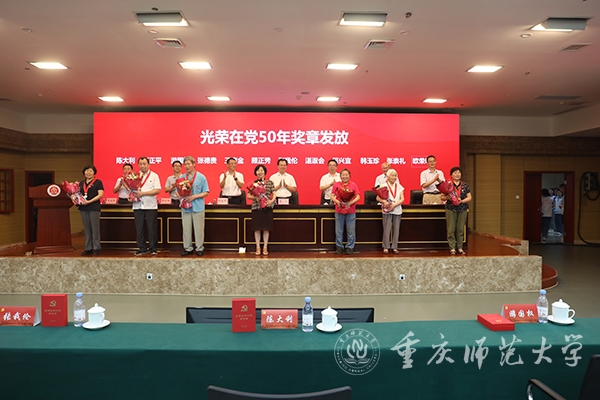 全体校领导为“光荣在党50年”的老党员颁发纪念章。随后,新党员向老党员敬献鲜花。