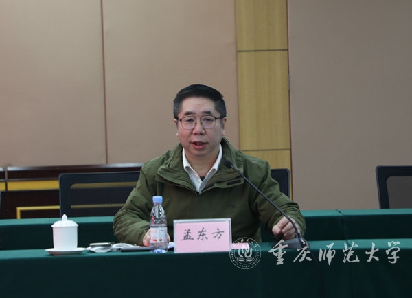 座谈会上,校长孟东方代表学校对汪明义一行的到来表示热烈欢迎。他表示,一直以来,重庆师大和四川师大在教师教育、科学研究等方面合作交流密切,特别是成渝地区双城经济圈建设以来,双方的合作交流更加紧密,两校未来的协同发展前景广阔。孟东方从学校基本情况、高水平师范大学建设、人才培养、专业建设、学科建设、人才队伍建设、科学研究、文化建设、数学学科建设、服务国家战略和区域发展等方面向到访来宾做了介绍。他指出,四川与重庆山水相依、血脉同源、文化同宗,川师与重师同为师范院校,合作历史悠久,渊源深厚,基础牢固,希望双方通过交流合作,加深双方友谊,形成协同创新发展的良好局面,在服务中西部师范教育和成渝地区双城经济圈建设做出新的贡献。