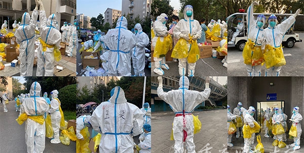 校内疫情伊始,为了让学生们及时、准确拿到检验结果,为了大家的“绿码”,所有人都在“拼命”,志愿者们全副武装投入“战场”,争分夺秒,与时间赛跑;由于各种资源的紧缺和相应经验的不足,第二日核酸检测工作安排表经常需要到凌晨两三点才能协调完成,志愿者们却能够在早晨7点30分准时到达校医院集合,迅速投入新一轮采集工作。前五天近26500余人次/天的核酸检测采集量,既有高风险区封控楼栋的上门扫楼,又有进园区的扩面检测,任务重、时间紧、要求高,平均每人每次采样量达五六百份以上。在长达三四个小时的核酸检测时间里,教职工志愿者们严谨地重复着单一的动作:扫码、询问核对姓名;在完成核酸信息采集工作后,他们脱下厚重的防护服,衣服、头发都已湿透,脸上也勒出了深深的口罩痕迹。“虽然有点累,但是能为校园防疫和师生健康出一份力我觉得很值得”“作为一名党员,有机会能成为‘大白’,为学校的防疫工作贡献自己的一份力量让我觉得非常骄傲”。这些都是志愿者老师们的心声。