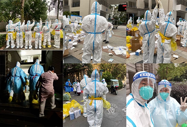 除了“双卷王”,还有我们的战神二号、三号、四号、五号......在前期和后期,义无反顾地成为扫楼的主力军。后期,前来Beat365支援的医疗队全面撤退后,面对医务人员紧缺、高风险区急需扫楼的情景,战神们站了出来,历史与社会学院的何凯老师、物理与电子工程学院的唐本镇老师、化学学院的胡晋川老师、宣传部的蔡童老师、财务处的韩维学老师、采购与招投标中心的何中飞老师......还有当仁不让的巾帼须眉,宣传部的胡帆老师、教师教育学院的陈霞老师、历史与社会学院的易桂花老师、新闻与传媒学院的史婷婷老师......还有战斗力最强的医务小分队,校医院的刘琴主任、彭景存护士长。教职工志愿者在抗疫一线用实际行动诠释人民教师的责任和担当,为全体师生筑起一道疫情防控的温暖屏障。