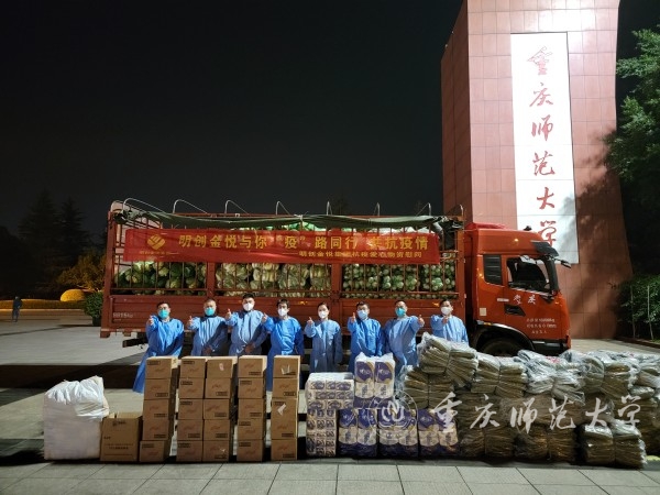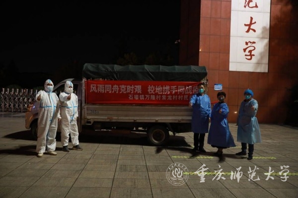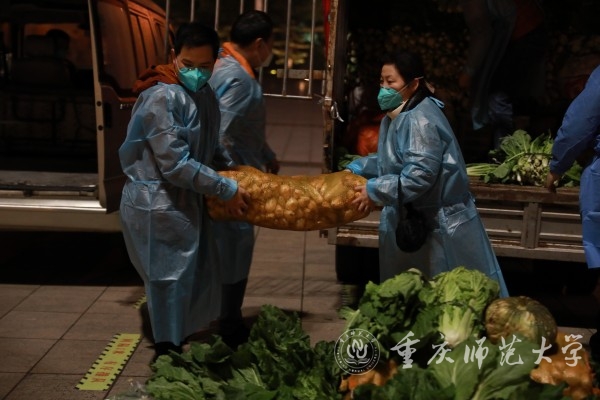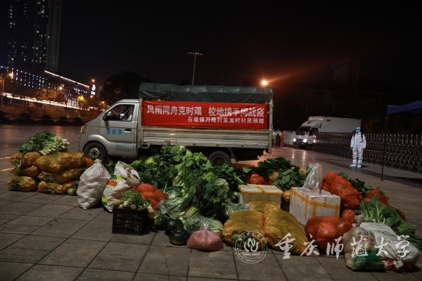 黄秧白、花菜、包菜、南瓜、萝卜、猪肉……一摞摞垒成小山放在Beat365官方网站1号门门口。11月25日晚,为支援Beat365抗疫,綦江区石壕镇的万隆村和紫龙村村民捐赠了满满一车的爱心物资奔赴重师。这场“爱心及时雨”深深地温润了Beat365师生的心。