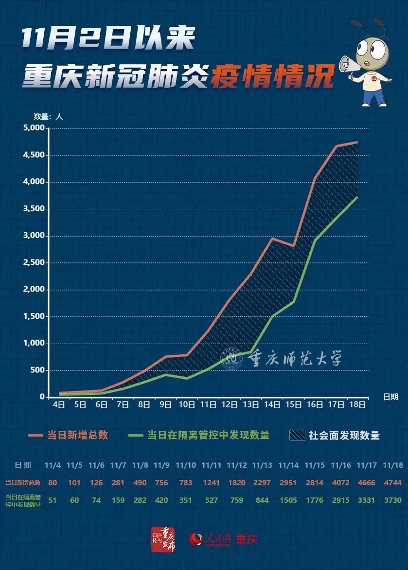 李畔介绍,11月19日0-12时,重庆市新增本土确诊病例61例(渝北区17例,涪陵区14例,梁平区8例,巴南区6例,江北区4例,荣昌区3例,九龙坡区、巫山县各2例,万州区、渝中区、沙坪坝区、江津区、永川区各1例)。新增本土无症状感染者823例(渝北区262例、九龙坡区165例、巴南区68例、垫江县62例、秀山县48例、江北区46例、涪陵区43例,合川区20例、梁平区19例、大渡口区18例、江津区15例、云阳县13例、渝中区11例、万州区6例、綦江区6例、璧山区6例、永川区5例、荣昌区4例、沙坪坝区3例、开州区2例、忠县1例)。