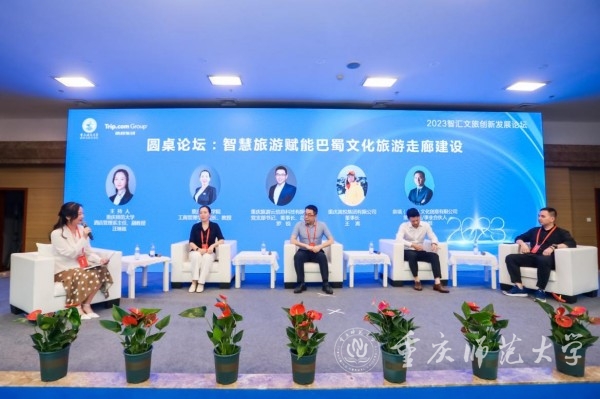 大会还围绕“智慧旅游赋能巴蜀文化旅游走廊建设”举行了圆桌论坛。重庆科技学院工商管理学院院长江燕玲,重庆旅游云信息科技有限公司党支部书记、董事长、总经理罗锐,重庆嵩悦集团有限公司董事长王嵩,泉境(重庆)文化创意有限公司策划总监/事业合伙人罗尚焜分别从教育、行业、企业、业态等多个视角围绕论坛主题进行了深入讨论。