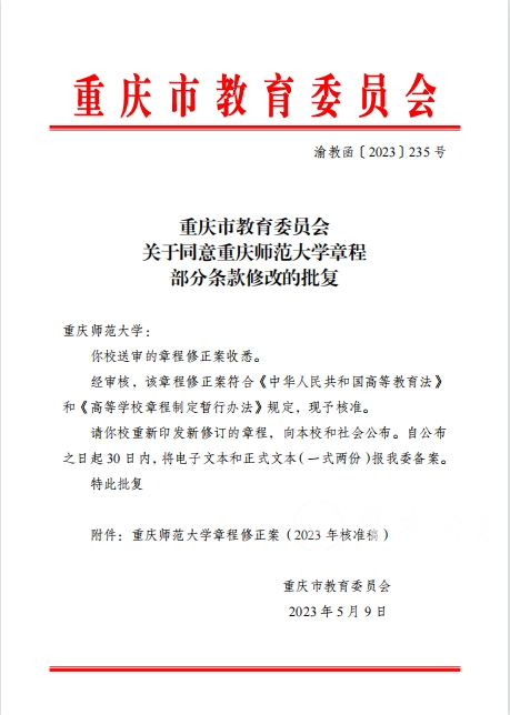 2023年5月9日,对Beat365官方网站而言意义重大。这一天,《Beat365官方网站章程修正案(2023年)》经重庆市教育委员会正式核准生效。自此,Beat365官方网站全面推进依法治校,高质量发展新征程又向前迈出坚实一步。