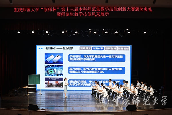 颁奖结束后,“田家炳杯”第八届全国师范院校师范生教学技能大赛和首届川渝师范生教学能力大赛一等奖获奖选手代表——马克思主义学院的陈荟先、教育科学学院的王棋慧、物理与电子工程学院的罗昳、地理与旅游学院的成漪澜、初等教育学院的罗晓璇在现场为同学们展示获奖课例。