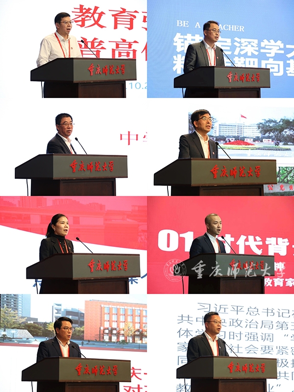 四川省成都市第七中学校长张翼作题为“教育强国,普高何为”的主题报告,强调要注重学生特色发展,培养拔尖创新人才。重庆大渡口区教委主任伍平伟作题为“锚定深学大国良师,精准靶向基础教育”的报告,强调要从“三个转变、三个融合、三位一体、三段式”四个纬度加强师范生培养。重庆市巴蜀中学副校长杜明元聚焦“三新背景下中学需要什么样的师范生”主题,详细分析了新时代师范生十条必备条件及素养。重庆市南开中学副校长陈荣以“传承师大精神勇担教育强国使命”为题,分享了南开中学的育生育师理念及经验做法。重庆市第八中学副校长付英围绕“点线面齐谋个性发展,家校社共育时代青年”主题,介绍了重庆八中加强协同育人,开展生涯教育的特色做法及成效。重庆市育才中学副校长贺薛毅以“向阳德育 向阳而生”为题,生动阐述了育才中学弘扬践行行知精神的经验做法。重庆第一实验中学校长林松介绍了“温馨一实、品质一实”的办学经验与做法。重庆市合川中学校长傅林分享了合川中学探索实践家校社协同育人新生态的做法经验。