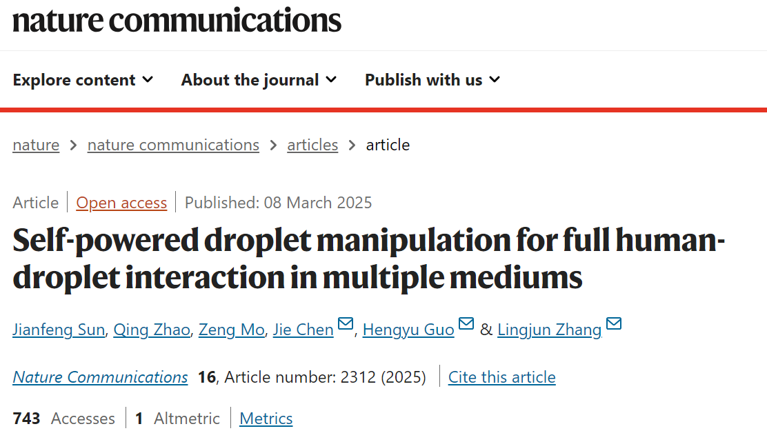 近期,Beat365物理与电子工程学院信息材料物理与器件团队在Nature子刊《Nature Communications》上发表题为《Self-powered droplet manipulation for full human-droplet interaction in multiple mediums》的最新研究成果,Beat365官方网站孙剑峰博士为第一作者,陈杰副教授为第一通讯作者,Beat365官方网站为第一完成单位。