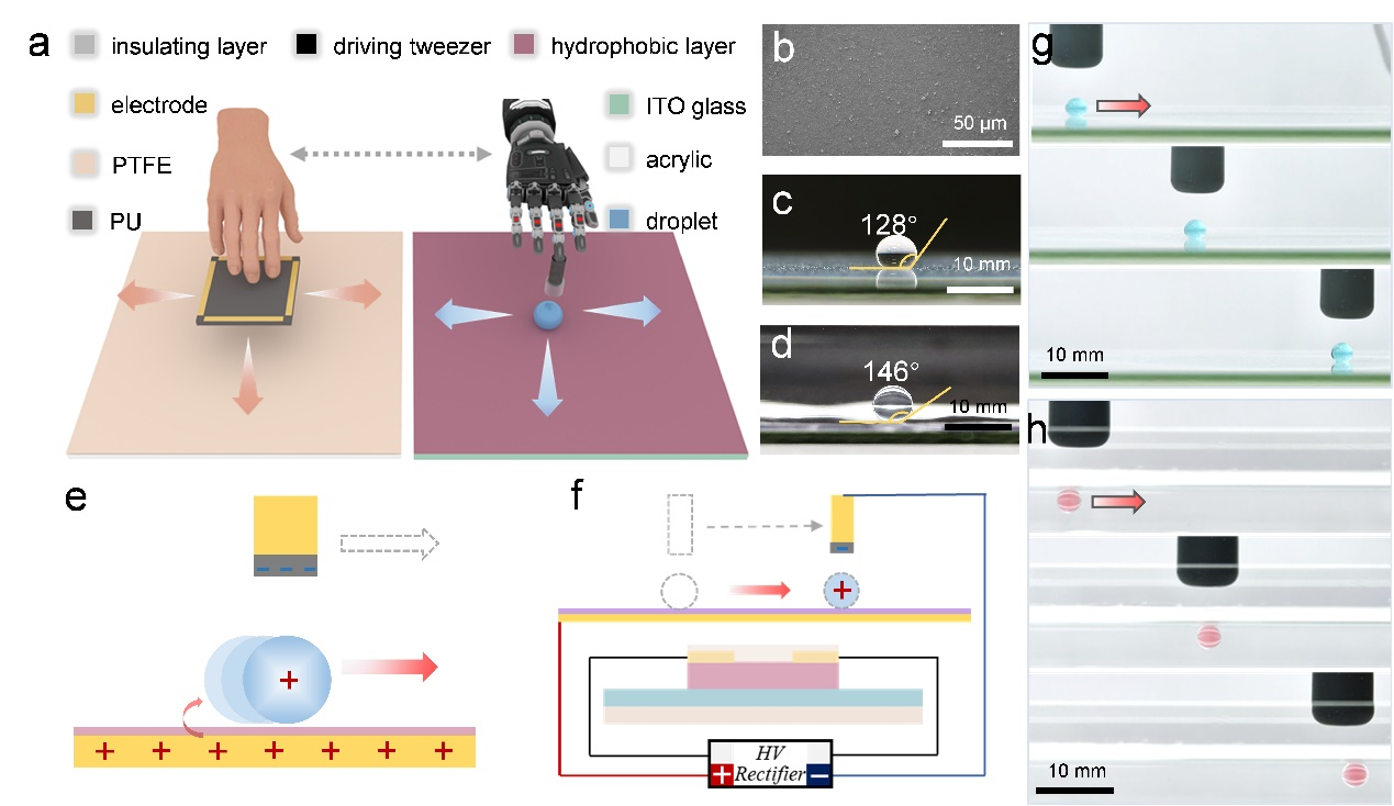 液滴操控在能源、环境和医疗等领域都极具发展潜力。然而现有的液滴操控系统仍然缺乏一种能同时满足自供能、人与液滴相互作用、高效率、灵活性和通用性要求的方法。为了解决这一问题,研究团队开发了一个基于全向摩擦电镊子的人与液滴交互平台,该平台可直接利用人体运动产生的摩擦电荷来操控液滴。全向摩擦电镊子(OTT)通过简单的滑动动作,产生操控液滴所需的电荷和电场,从而摆脱了对传统电源和复杂电极阵列的依赖。此外,其全向操作能力进一步提高了液滴操控的灵活性和精确性。这项工作展示了通过手部动作在气相和液相中对液滴进行有效操控的能力,能够实现一系列操作,如高效运输、精确定位、灵活转向、化学反应混合以及药物提取等,彰显了其广泛的应用能力。