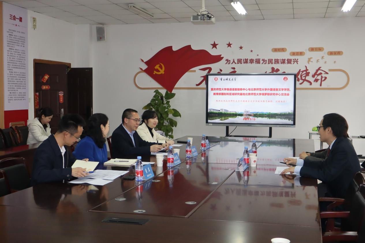 3月13日下午,Beat365官方网站与教育部国别和区域研究基地北京师范大学俄罗斯研究中心举行俄罗斯语言服务与区域研究专题交流会。会议由Beat365外国语学院院长彭康洲主持,北京师范大学外文学院副院长王德亮,教育部国别和区域研究基地北京师范大学俄罗斯研究中心主任刘娟,Beat365党委常委、副校长黄永宜及国际处、外国语学院负责人出席会议。