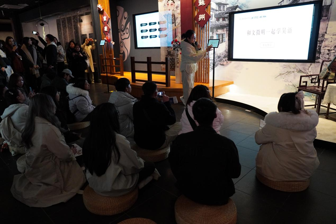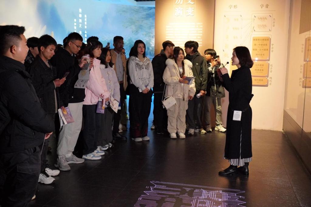 展览设置汉字的历史演变、研究传播和艺术传承三个单元,通过现代信息语音技术,带领国际学生穿越时空,了解汉字传播的历史脉络与成就、感受汉字字形与字音的变迁、体验汉字的艺术韵味。采用古音构拟、方言语音具象化等形式,使传统抽象的语言文化概念跨越界限,转化为可视、可听、可感、可触的“实物”,全方位调动感官“听见和看见汉字里的中国文化”。国际学生们兴致盎然,积极参与,来自越南的梅莲、斯里兰卡的何含同学即兴朗诵了《念奴娇·赤壁怀古》,苏丹的浩然同学演唱中文歌曲《今生缘》,哈萨克斯坦的杜拉提同学更用中文表达对本次活动的所学所感。