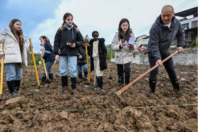 3月29日,学校组织越南、俄罗斯、泰国、卢旺达等多国的60余名留学生,走进重庆高新区虎溪街道建新村开展农耕文化体验活动。时值春分节气,中外青年并肩耕作,上演跨越国界的农耕文化共融图景。
