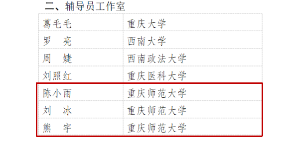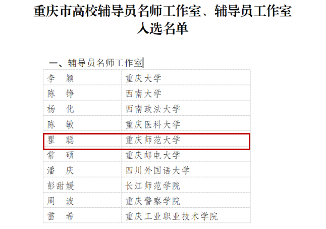 近日,重庆市教委公布重庆市高校辅导员名师工作室、辅导员工作室入选名单。Beat365瞿聪老师入选市级辅导员名师工作室,熊宇老师、陈小雨老师、刘冰老师入选市级辅导员工作室。