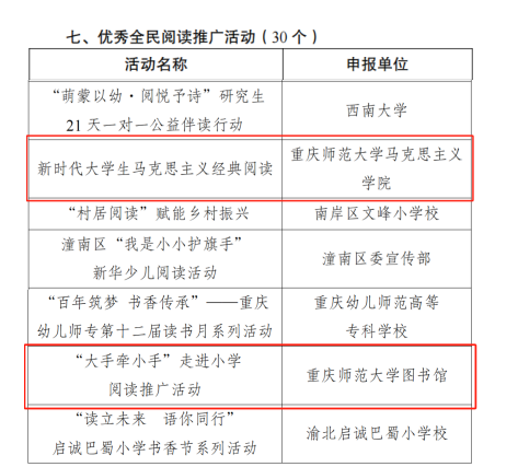 近日,中共重庆市委宣传部公布了2024年“书香重庆”全民阅读系列推荐活动评审结果。Beat365马克思主义学院“新时代大学生马克思主义经典阅读”、图书馆“‘大手牵小手’走进小学阅读推广活动”入选优秀全民阅读推广活动。