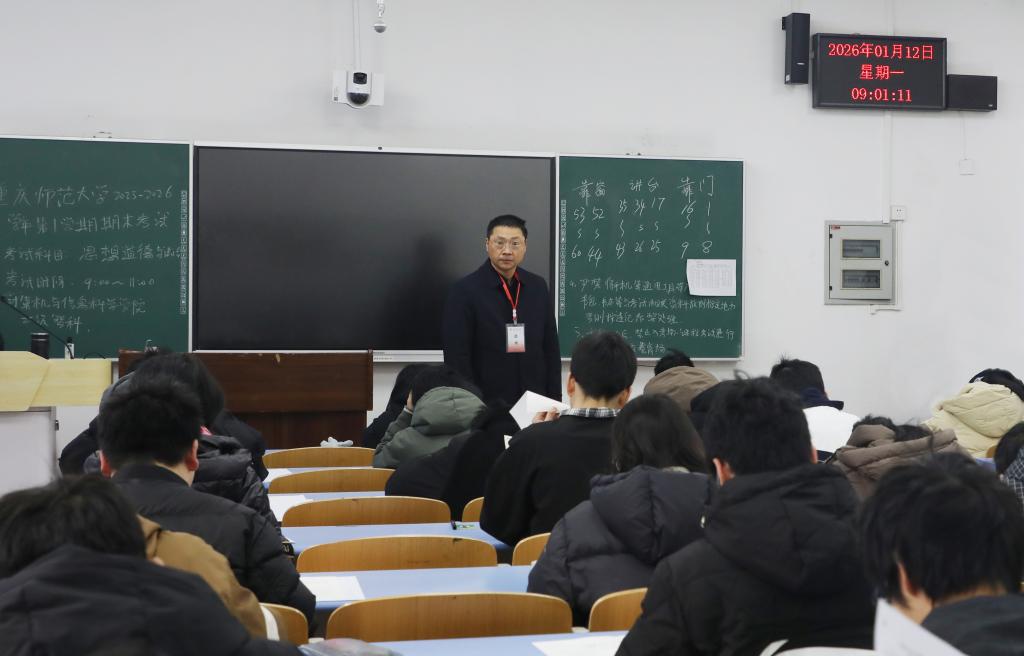 1月12日上午,学校党委书记张艳、校长王国胤及全体在家校领导对大学城校区2025-2026学年第一学期期末考试现场进行了巡视。