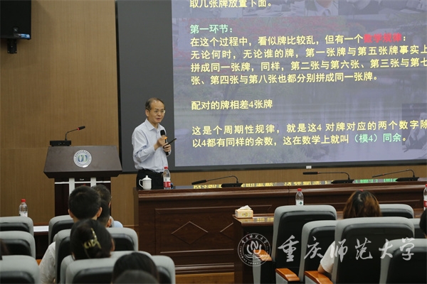 周向宇首先以春晚扑克牌魔术引入讲座。他指出,精彩魔术的背后是数学的神奇,其中涉及中国古代创建的同余思想与理论,包括“物不知数”问题以及“神机妙算”之解和中国剩余定理,中国古代数学的“言约旨远”是透过其“言约”,揭示其“旨远”。中国古代数学思想与成就,复原了商高对勾股定理的证明,揭示了其中蕴含的商高“折矩”原理、“积矩”思想和商高-赵爽的“形体不变量”思想。
