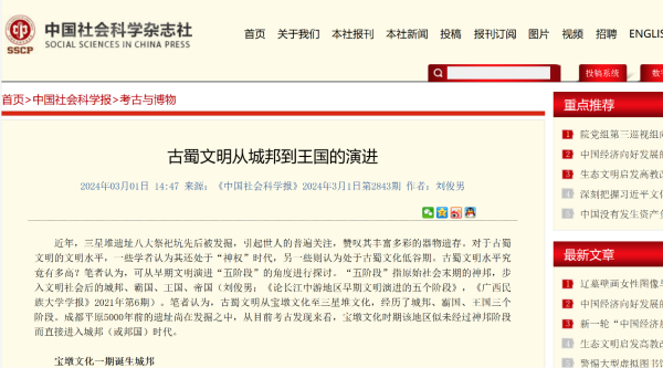 近年,三星堆遗址八大祭祀坑先后被发掘,引起世人的普遍关注,赞叹其丰富多彩的器物遗存。对于古蜀文明的文明水平,一些学者认为其还处于“神权”时代,另一些则认为处于古蜀文化低谷期。古蜀文明水平究竟有多高?笔者认为,可从早期文明演进“五阶段”的角度进行探讨。“五阶段”指原始社会末期的神邦,步入文明社会后的城邦、霸国、王国、帝国(刘俊男:《论长江中游地区早期文明演进的五个阶段》,《广西民族大学学报》2021年第6期)。笔者认为,古蜀文明从宝墩文化至三星堆文化,经历了城邦、霸国、王国三个阶段。成都平原5000年前的遗址尚在发掘之中,从目前考古发现来看,宝墩文化时期该地区似未经过神邦阶段而直接进入城邦(或邦国)时代。