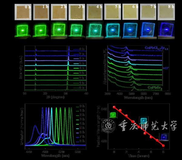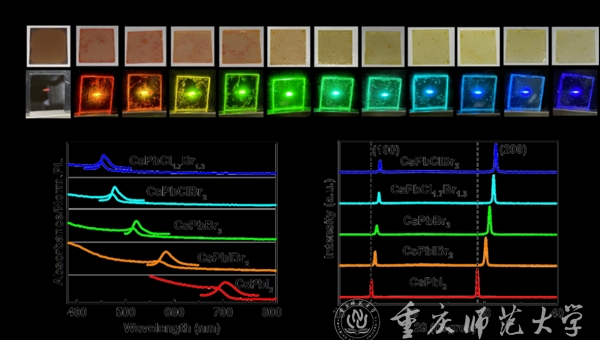 全无机卤化铅钙钛矿(LHPs)由于具有高吸光系数、高荧光量子效率、窄半峰宽、简单全溶液处理等优点,在光电和光伏器件领域具有广阔的应用前景。这类材料的最吸引人的特性是它们能够实现全可见光谱范围内的波长调谐,这使得该材料易应用于可调谐激光器的制备。根据分子特性,混合卤化物钙钛矿CsPb(Cl/Br)3和CsPb(Br/I)3可以在CsPbCl3、CsPbBr3和CsPbI3之间通过快速阴离子交换法得到整个可见光谱区域的明亮光发光(PL)。这种反应通常在液相进行,特点是反应速率快,使其难以持续和准确地控制卤素比。目前,已经有很多研究尝试来调节液相反应中的阴离子交换反应速率。然而,交换反应过程速度仍然太快,难以控制晶体动力学生长过程,也没有办法连续准确地控制卤素比。但减缓阴离子交换反应过程将有效地减少薄膜的表面缺陷状态,促进具有良好形貌和结晶度的高质量薄膜的形成,这有利于应用在光学放大器和激光器。