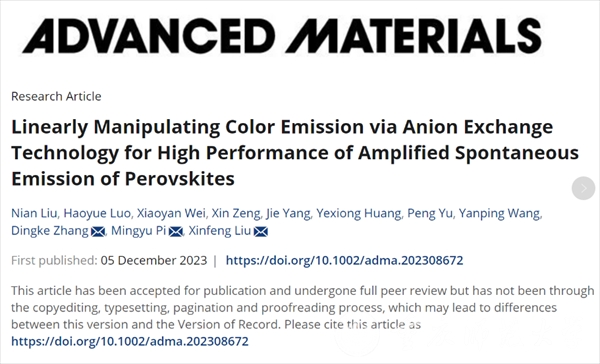 近日,物理与电子工程学院张丁可教授团队在钙钛矿激光领域取得重要研究进展,研究以“Linearly Manipulating Color Emission via Anion Exchange Technology for High Performance of Amplified Spontaneous Emission of perovskites”为题发表在学术期刊《Advanced Materials》(中科院1区,top期刊,影响因子32.086)。Beat365官方网站为第一署名单位,张丁可教授的研究生刘念为论文第一作者,Beat365张丁可教授、皮明雨副教授和国家纳米中心刘新风教授为共同通讯作者。