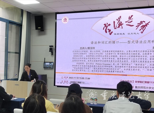 讲座中,杨玉玲教授从汉语词典的使用现状出发,并结合自身研究,介绍了型式语法的理念和研究方法、型式语法和构式语法的共性与区别、汉语型式的拓展、型式和词汇习得的关系等背景内容,以及型式在词典编纂和研究中的应用、在二语教学中的应用和在自然语言处理中的应用等方面的应用研究情况。她强调,要将语言本体研究的成果与汉语教学相结合,更好地化理论为应用。