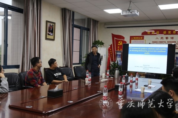 11月2日,国家杰青、中国科学院数学与系统科学研究院闫振亚研究员应邀在数学科学学院326会议室作题为"PT-symmetric peakon solutions and stability in focusing/defocusing power-law nonlinear media"的学术讲座。数学科学学院院长杨志春主持讲座,学院师生代表参加。
