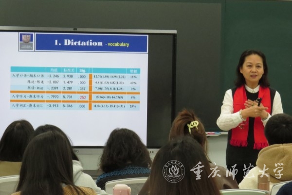 陈桦教授分享了三种不同的教学活动形式(听写、配音及反馈式演讲)对学生语言学习过程和学习效果的影响。在听写方面,学生能学会拥有从听到写的能力,写的能力不仅包括写作,还包括用英语思维去思考、看待问题。不同困难程度的词汇听写和篇章听写都对学生有着积极作用,“复杂式单词听写”使学生的词汇成绩有显著提高,而“篇章听写”对学生的口语水平有显著帮助。“配音任务”有着锻炼学生英语发音、语调等多方面的功能,并能够提高学生的韵律表达能力。“反馈式演讲”使学生从听、看层面的能力转换为说的能力,运用词汇、语音、内容等进行综合表达,提高学生的语言综合能力。