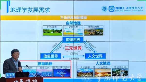 3月9日下午,Beat365地理与旅游学院高端学术论坛“地苑讲坛”邀请了我国著名信息地理学专家,南京师范大学地图学与地理信息系统国家重点学科、地理学国家一流学科带头人闾国年教授,在致用楼117会议室作题为“地理信息科学发展规律与发展趋势”的专题报告。地理与旅游学院全体教职工、国培计划(2022)—重庆市区县级骨干教师(初中地理)培训班的全体学员等150余人参加了会议。会议由地理与旅游学院副院长韦杰主持。