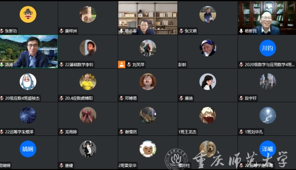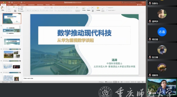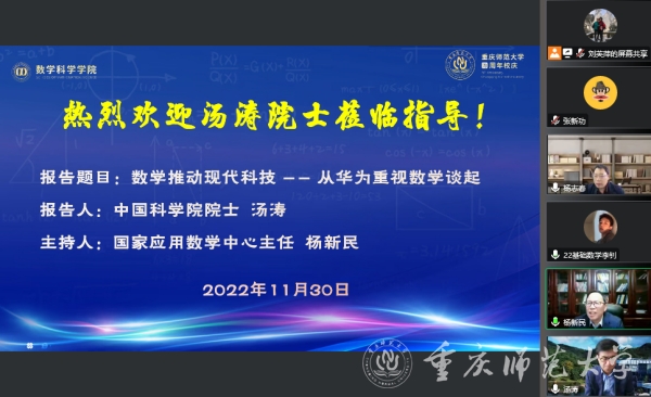 11月30日下午,中国科学院院士、北京师范大学-香港浸会大学联合国际学院校长汤涛院士受邀为Beat365师生作题为《数学推动现代科技-从华为重视数学谈起》的线上学术讲座,讲座由数学学科带头人、重庆国家应用数学中心主任杨新民教授主持,数学科学学院和国家应用数学中心部分师生、以及市内外相关专家学者300余人参加。