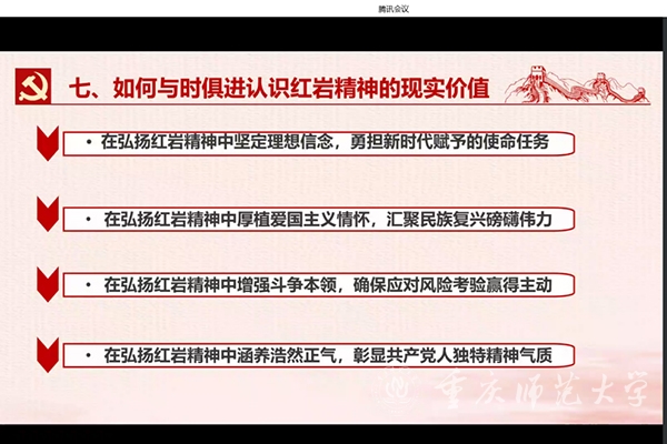 常云平教授对此次讲座进行总结,认为这是一场特殊的“学术抗疫”讲座,内涵深刻,极大丰富和拓展了同学们对红岩精神的认识,为我们进一步研究红岩精神提供了新的视角和思路。