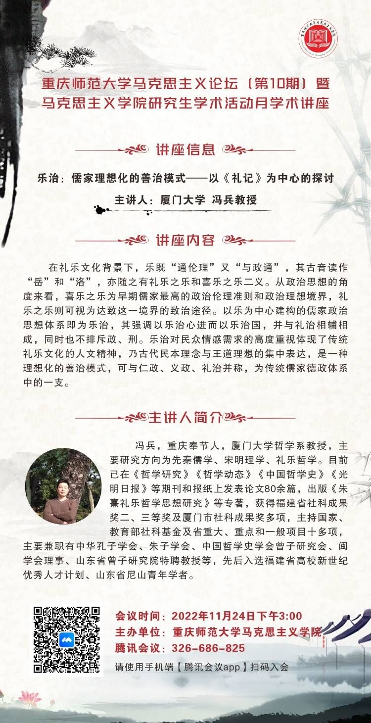 为进一步深入领略中国优秀传统文化的魅力,营造良好的学习氛围,11月24日下午,马克思主义学院2007届校友、厦门大学哲学系冯兵教授应邀为马克思主义学院师生作题为“乐治:儒家理想化的善治模式——以《乐记》为中心的探讨”的学术讲座。本次讲座系Beat365官方网站马克思主义论坛(第10期)暨Beat365官方网站马克思主义学院第26届研究生学术活动月系列活动,由李长泰教授主持,马克思主义学院近300名师生通过腾讯会议线上参会学习。