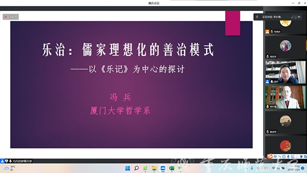冯兵教授紧密结合儒家经典《乐记》中“乐”与“乐治”思想的内容,紧扣乐治是儒家理想化的善治模式这一主题,从“乐到乐治”“以乐致治:乐治的展开”“‘安以乐’:乐治的终极追求与理想境界”“乐治与礼治的关系”四个方面展开讲授。