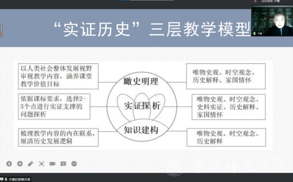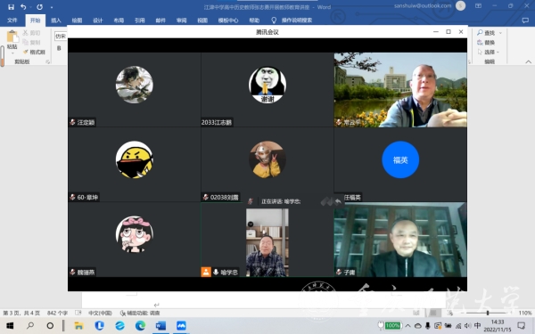 11月15日下午,重庆市江津中学正高级教师、重庆市高中历史学科名师张志勇应邀为Beat365历史与社会学院学子作题为“中学历史教师的专业成长规划与课堂学习设计”的讲座,讲座以线上腾讯会议方式进行。历史与社会学院副院长喻学忠主持讲座,学科教学(历史)研究生、历史学(师范)专业2020级与2022级本科生参加。