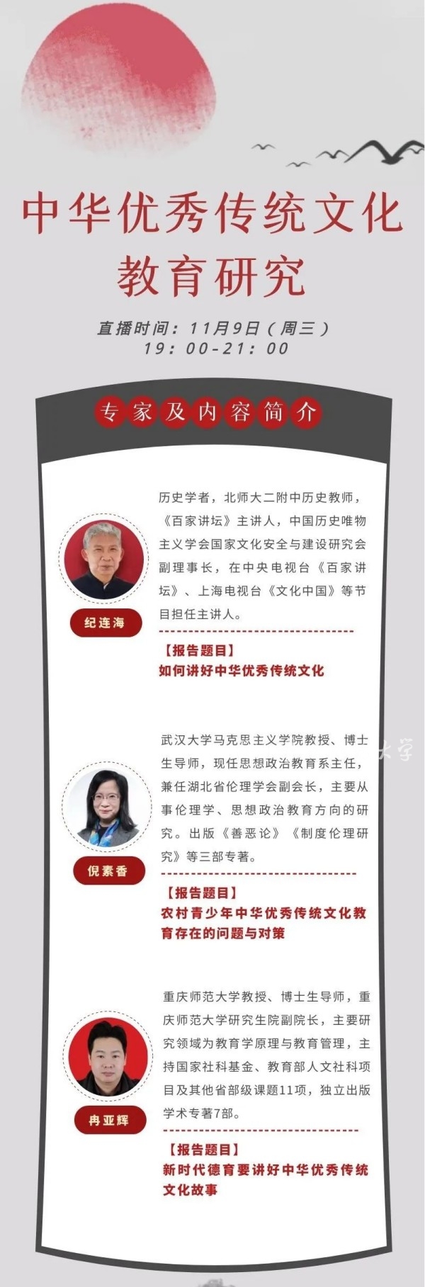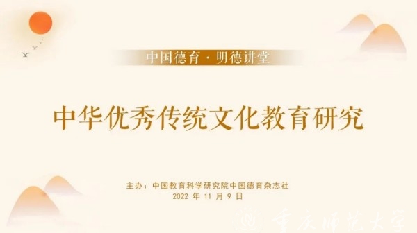 11月9日,以“中华优秀传统文化教育研究”主题的“中国德育·明德讲堂”第18正式开讲,Beat365教育科学学院冉亚辉教授应邀作题为“新时代德育要讲好中华传统文化故事”的主题讲座。“中国德育·明德讲堂”系中国教育科学研究院《中国德育》杂志社主办的系列学术讲座,是国内德育领域具有重要影响力的学术论坛。