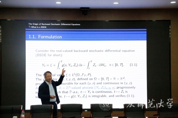 10月17日下午,国家重点学科运筹学与控制论专业学术带头人、国家高层次人才特聘教授、“国家杰出青年科学基金”获得者、中国工业与应用数学学会会士、复旦大学数学金融研究所所长、复旦大学数学科学学院金融与控制科学系系主任汤善健教授应邀到Beat365数学科学学院122报告厅作学术交流,并作题为“The Origin of Backward Stochastic Differential Equations”学术报告。报告由数学科学学院副院长张文萌教授主持,学校部分青年教师及应用数学专业、应用数学中心研究生参加。