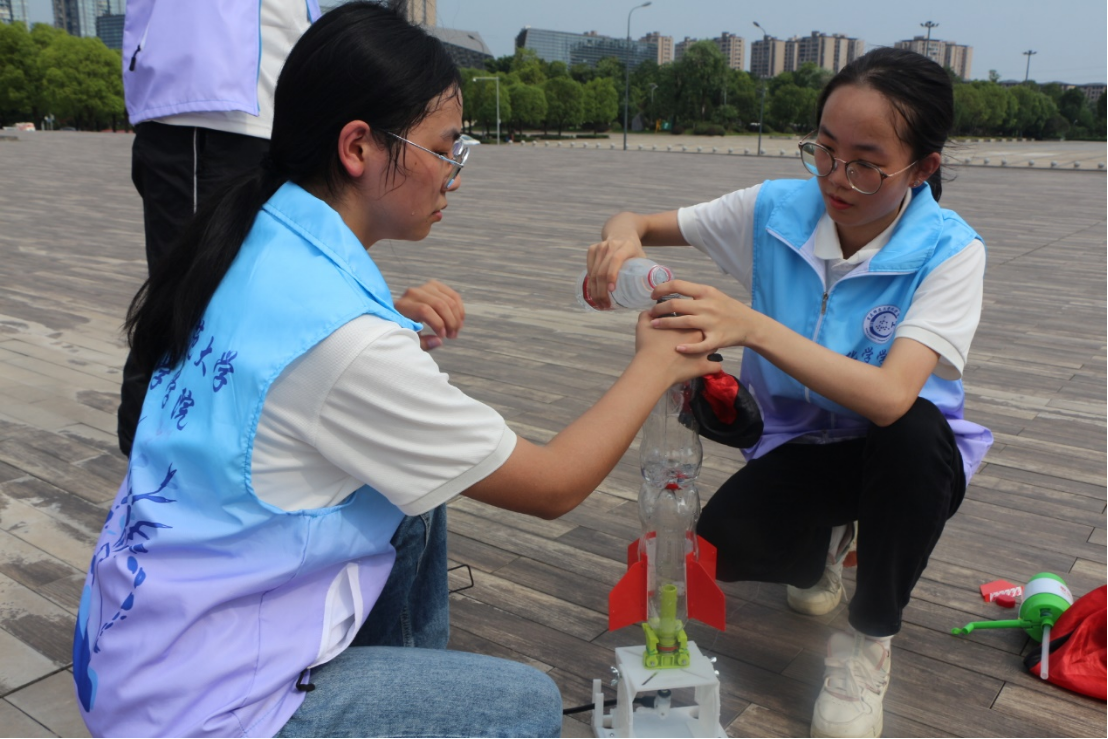 志愿者成功发射二级水火箭 李佳骏 摄
