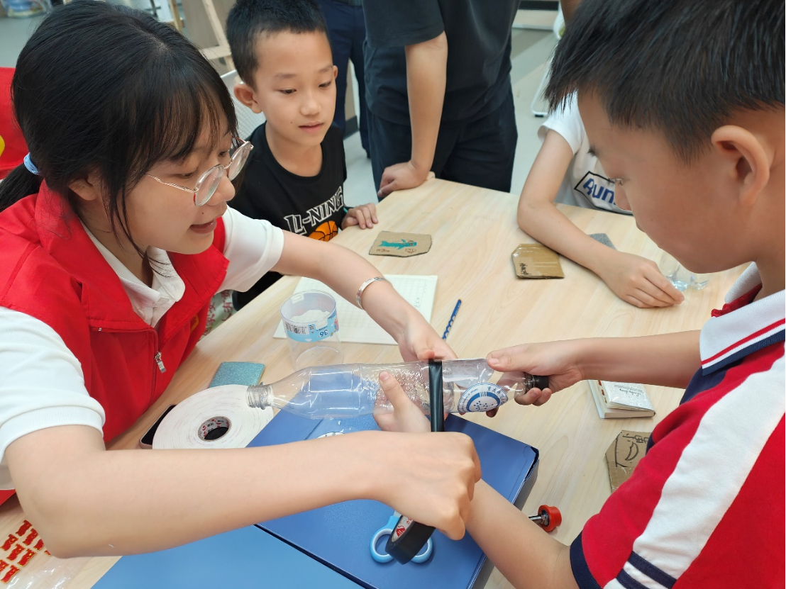 志愿者帮助小朋友们制作“水火箭” 李佳骏 摄