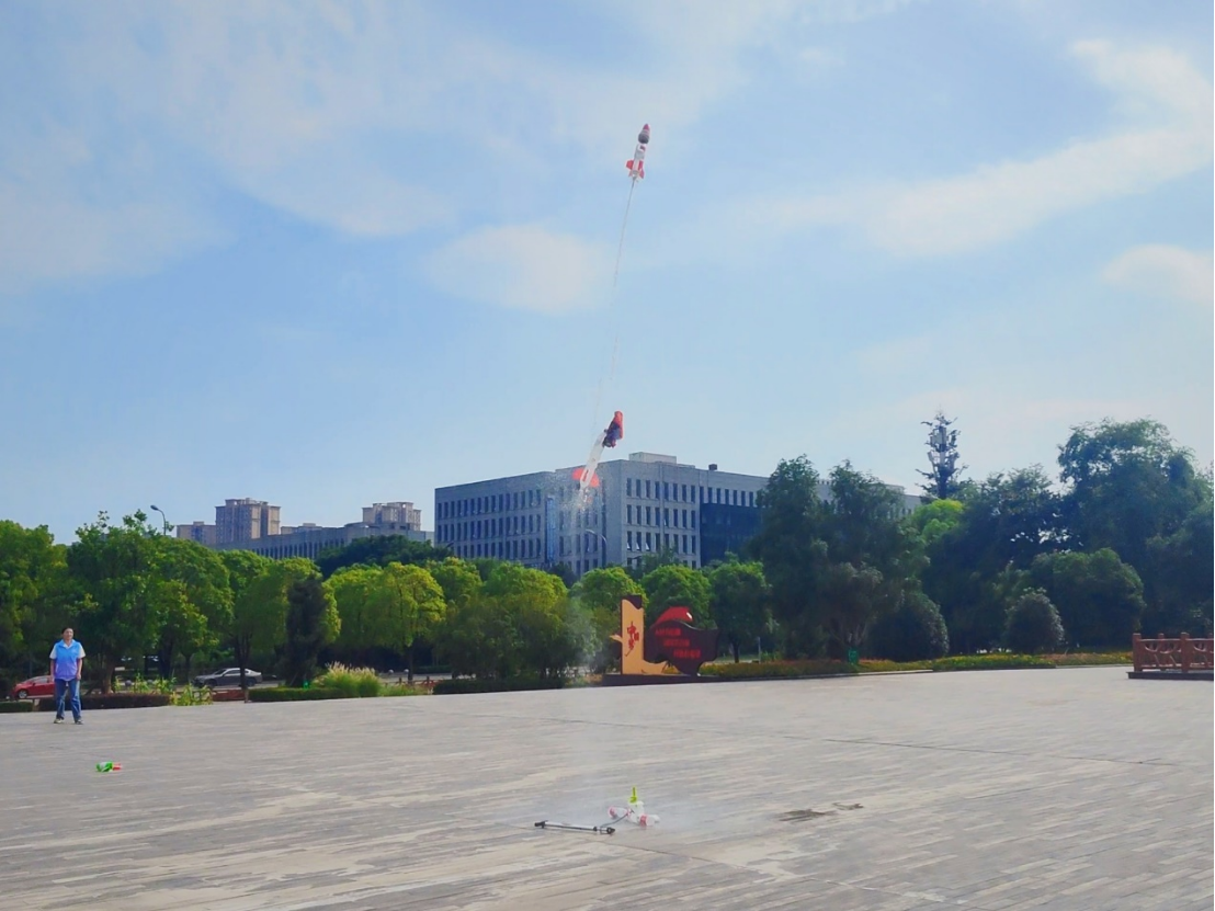 “打气完毕,准备,3、2、1发射!”话音刚落,一支“火箭”伴随着水汽冲向天空……二级水火箭的发射非常成功!随后发射小朋友亲手制作的一级水火箭,火箭在天空划过一道弧线,小小的水火箭升空,承载着他们大大的梦想,追逐落地的火箭,感受科学的美好。实践团通过室内外课堂联合开展,将理论与实践相结合,知行合一,提升小朋友们的科学素养,促进小朋友的全面发展。