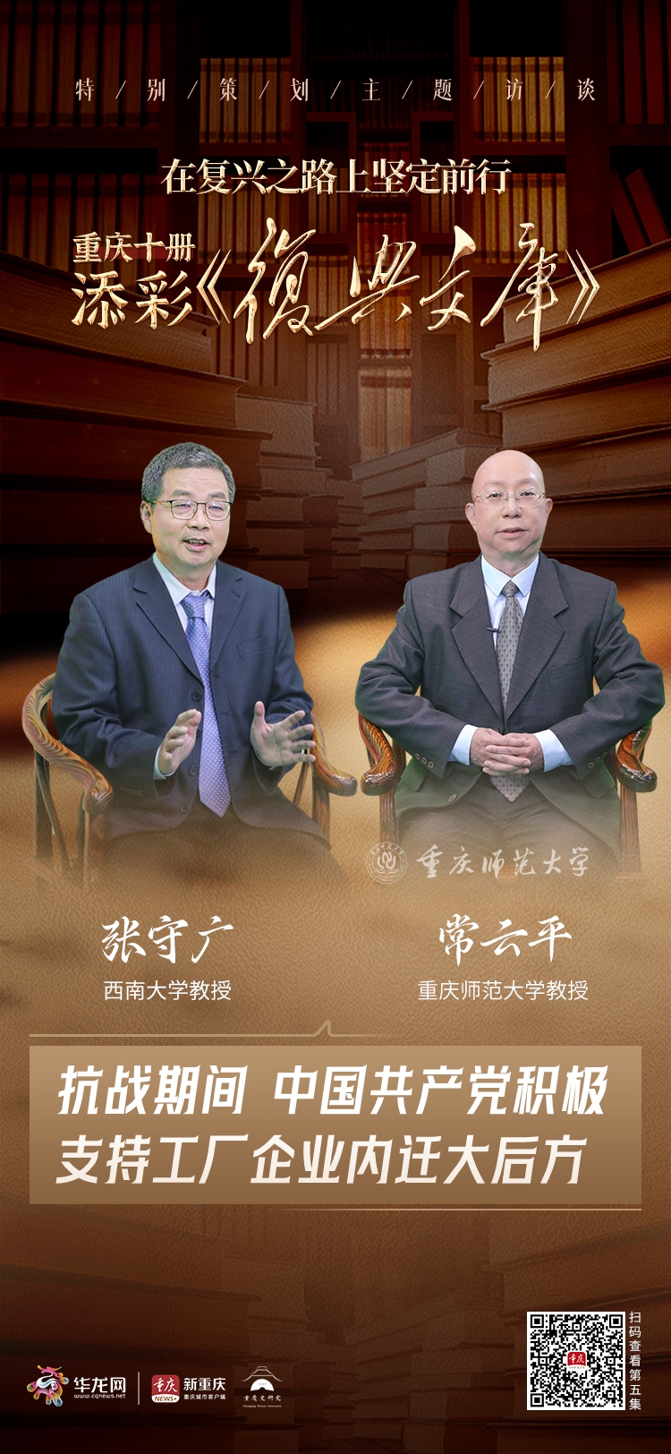 继《人间正道是沧桑——百年百篇 留声复兴之路》之后,华龙网-新重庆客户端再次携手全国党史研究领军人物、中国抗日战争史学会副会长、重庆史研究会会长周勇教授及其团队,推出特别策划《在复兴之路上坚定前行——重庆十册 添彩<复兴文库>》主题访谈。