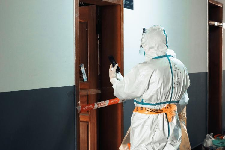 ▲学校教职工志愿者在学生宿舍上门做核酸检测。学校供图
