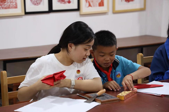 7月15日,Beat365官方网站三春学子实践成长营前往习水“善行贵州•益童乐园”公益服务站学习并体验剪纸艺术。站内剪纸手艺人为一群学龄儿童,他们手把手教学,带领成长营师生一起进行剪纸艺术体验。剪刀上,一双双小小的手,“咔嚓,咔嚓……”一幅幅栩栩如生的图案跃然纸上,手艺精湛令人拍手叫绝。